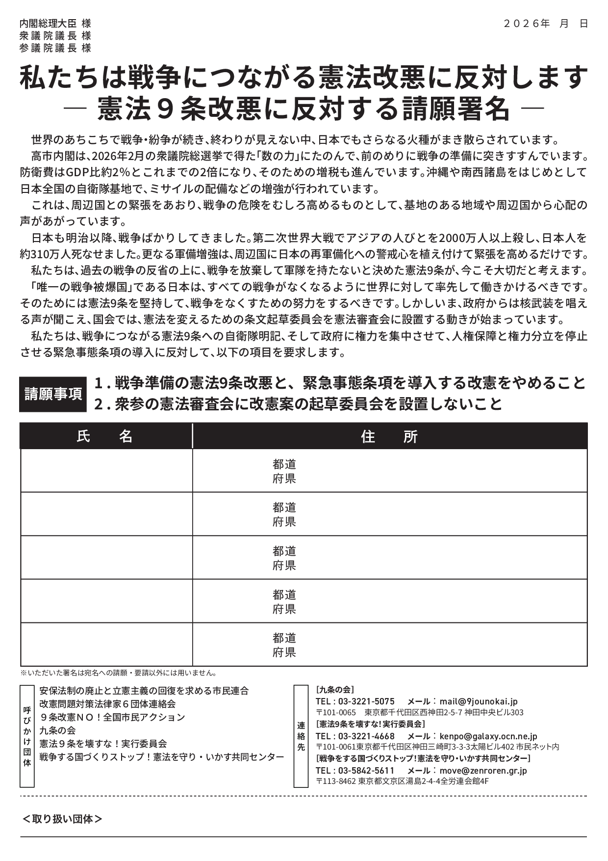 この危機に際し、従来から平和と民主主義、自由のために運動をしてきた6つの団体が共同して、「憲法9条改悪に反対する請願書名」への取り組みを呼びかけます。ご協力をお願いします。